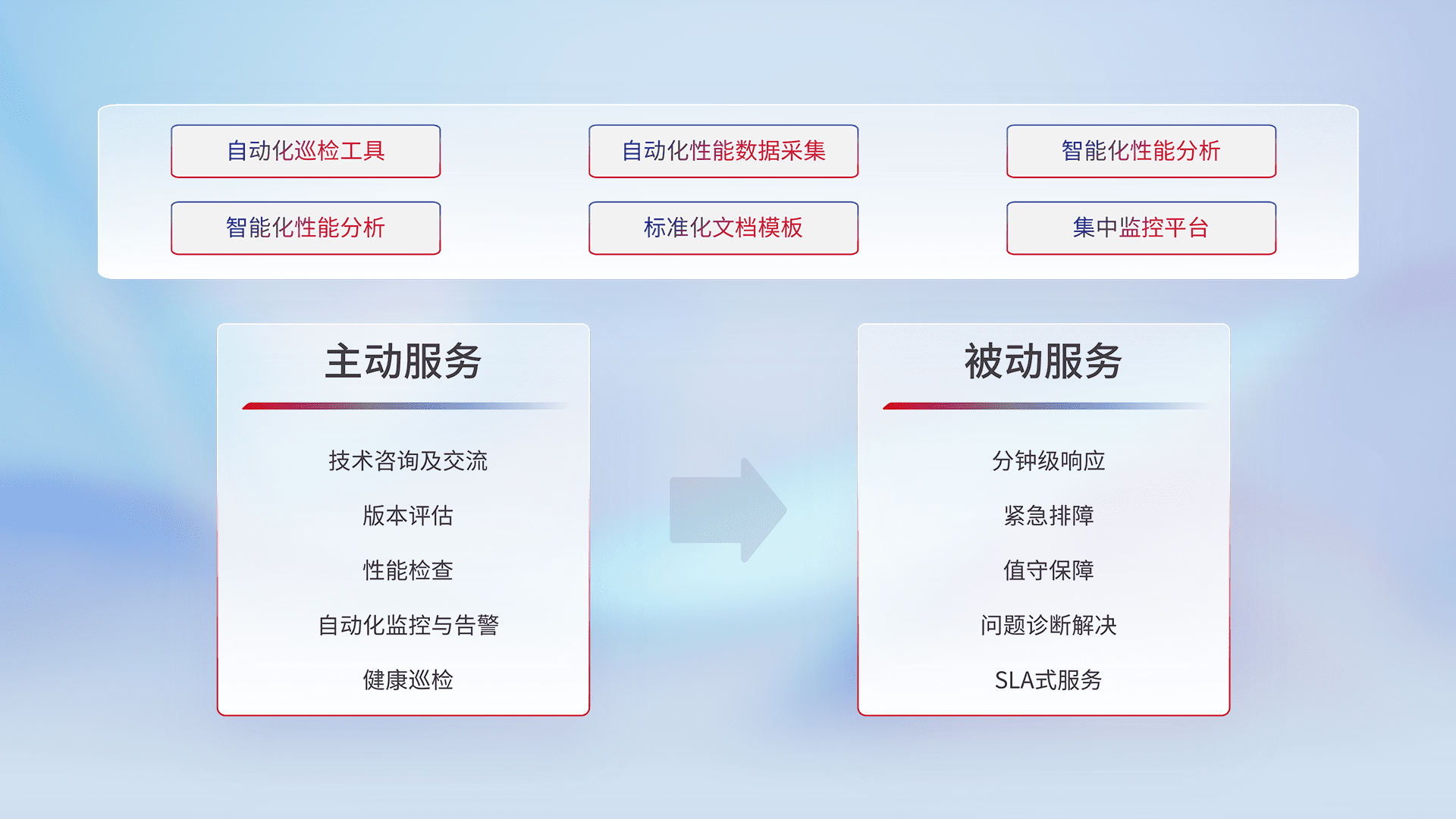 智能化工具和标准化文档,,,,保障服务质量,,提供主动服务(包含技术咨询、、版本评估、、、性能检查、、、自动化监控与告警、、、、健康巡检)和被动服务包含(分钟级响应、、、、紧急排障、、、值守保障、、、问题诊断解决、、、SLA服务)。。
